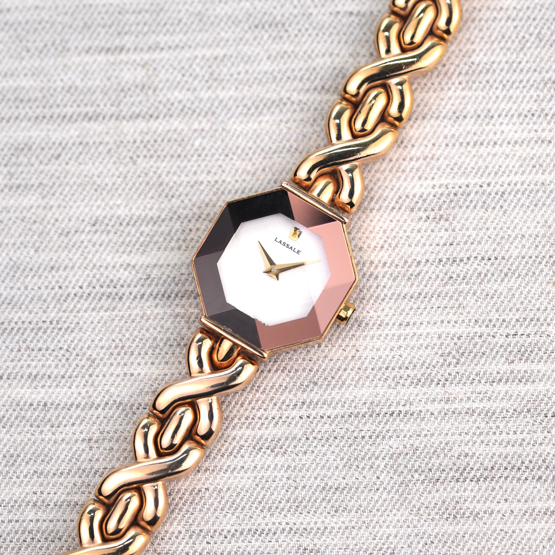 Rare Lassale Seiko watch with octagon dial and faceted crystal with rose gold bracelet. Dial is a shimmery very pale pink color.