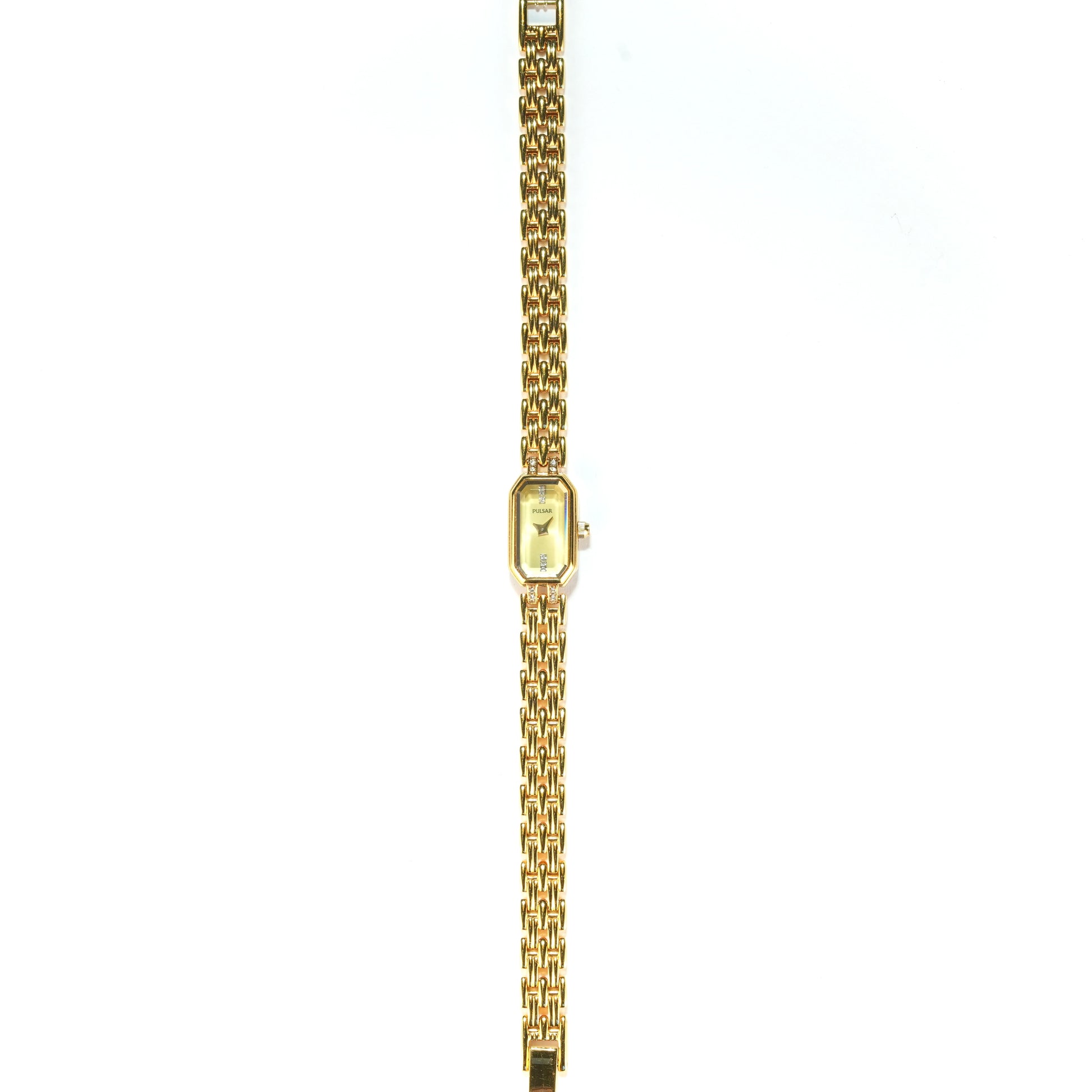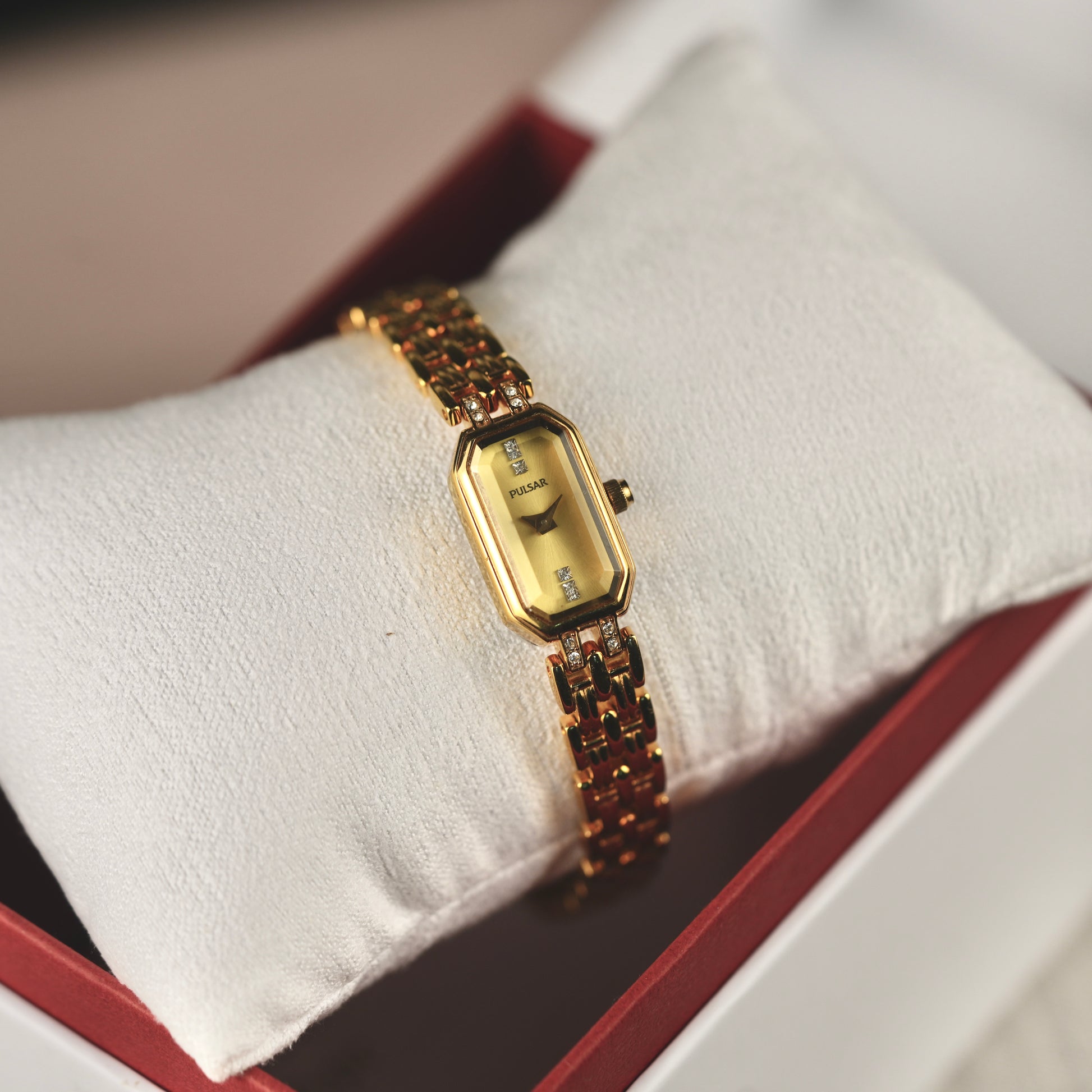 New old stock Pulsar watch with faceted dial and Swarovski crystal accents. Watch comes with original box.