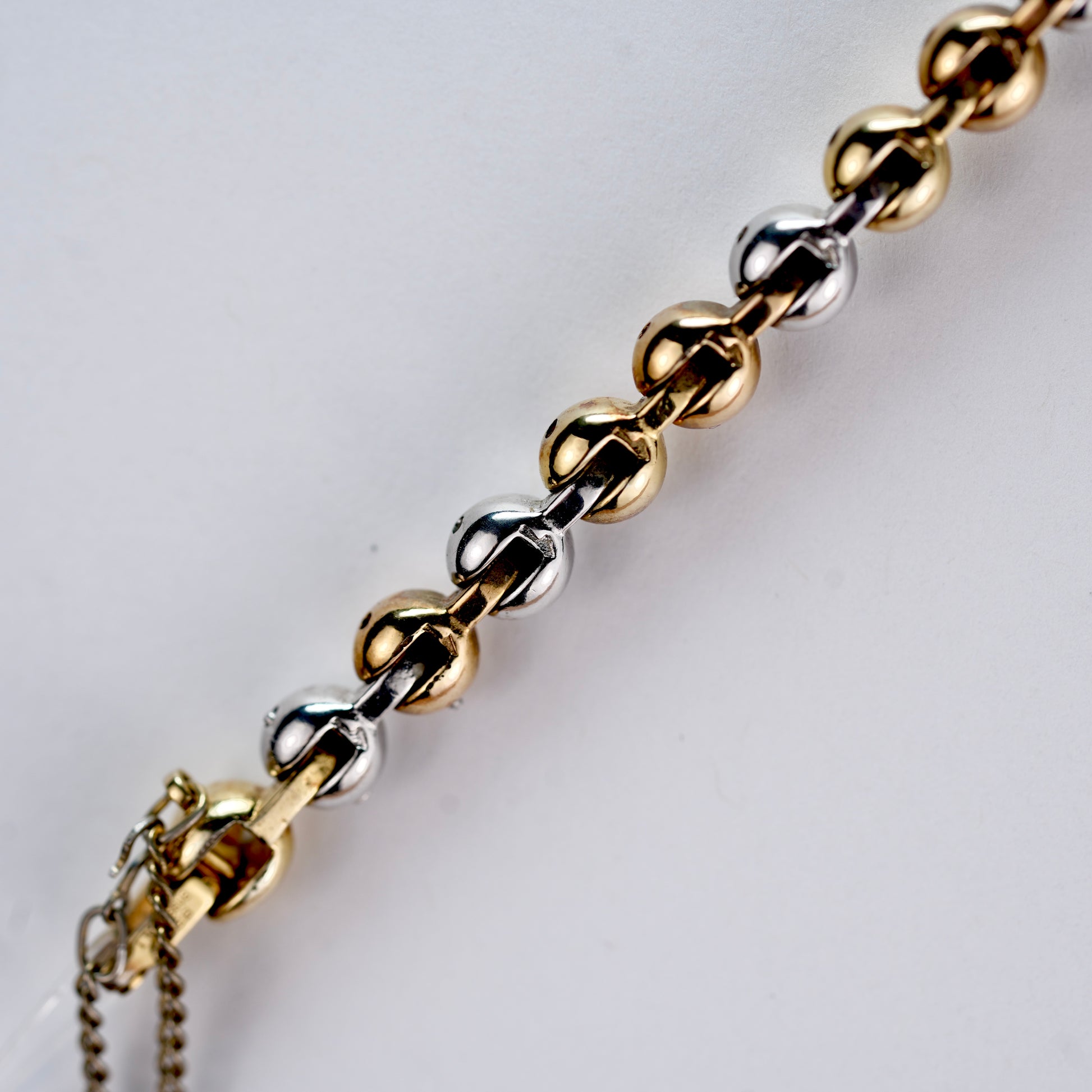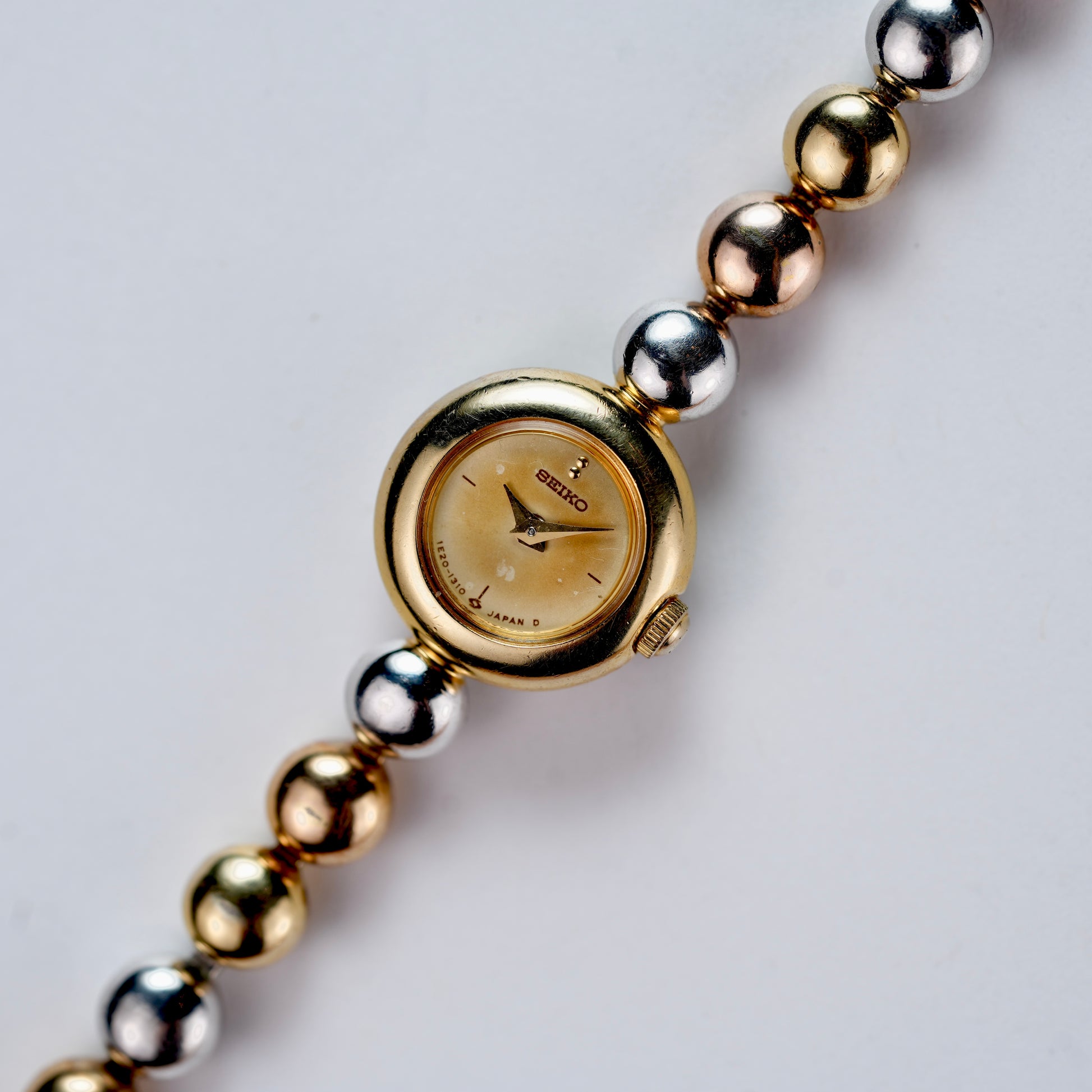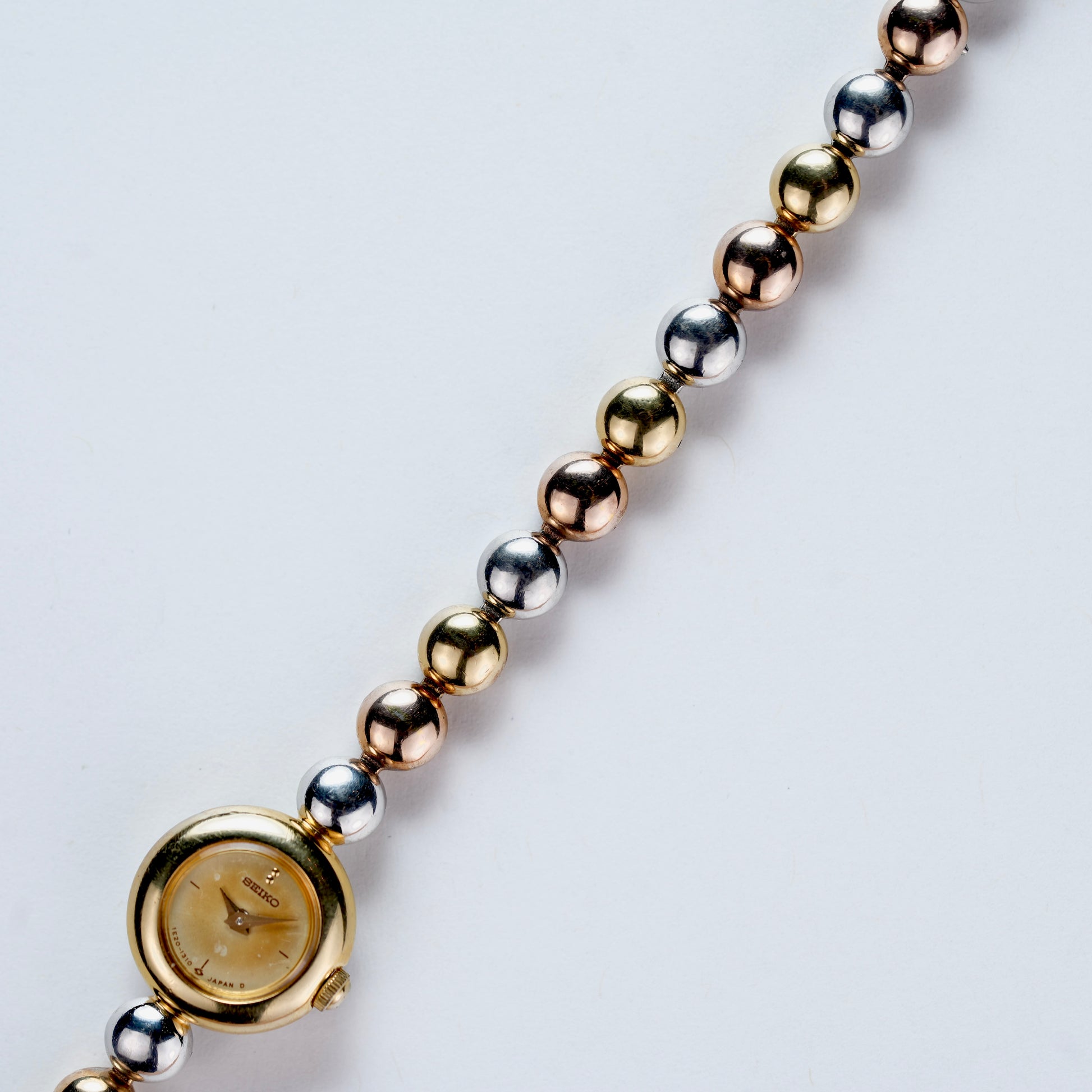 Unique Seiko watch with ball bead bracelet in rose, white, and yellow gold color. A popular model introduced in the late 80s and early 90s marketed only available in SE Asia. The dial is the smallest circular dial offered by Seiko with a diameter of only 13.6mm.